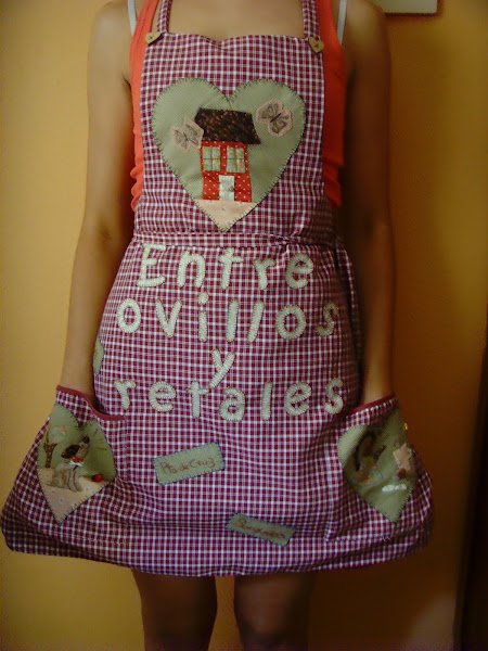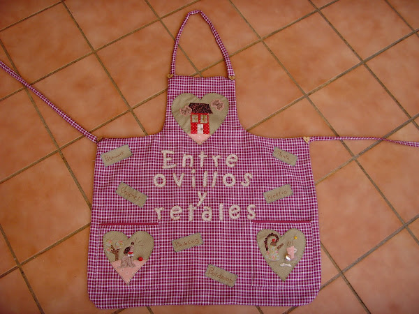 Bueno pues colocados ya los corazones pensé que a mi delantal le faltaba algo muy importante, un nombre, y qué mejor que el nombre de mi blog: ¡Entre ovillos y retales!, sí señor, al fin y al cabo, es para el uso que le voy a dar!
