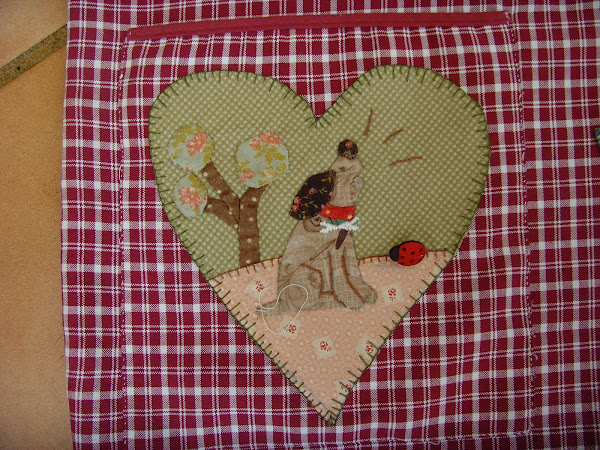 El primer corazón es mi casa, bueno, o una parecida, está cosida como aplicación sobre un gran corazón y después éste lo he cosido al delantal con punto de festón.