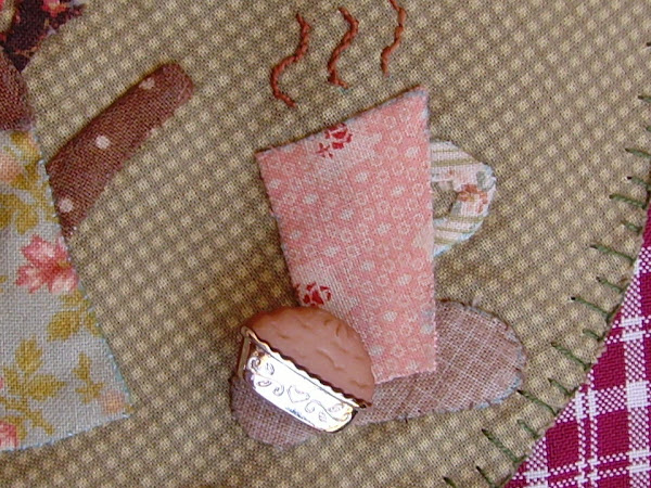 Esta taza de café está pidiendo un buen trozo de pastel! Pues ahí que lo coloco, me encanta tener botoncitos guardados porque nunca sabes para qué los puedes necesitar. Mirad cómo humea el café, venga, que se enfría.