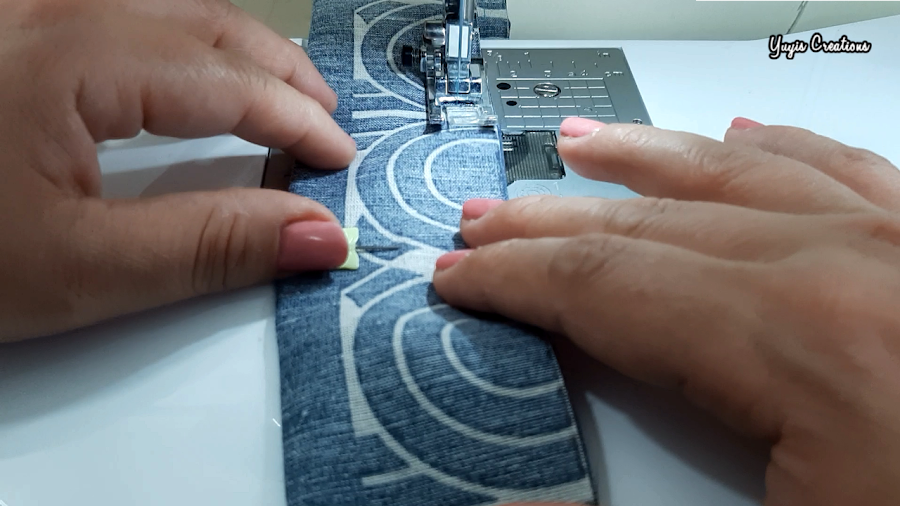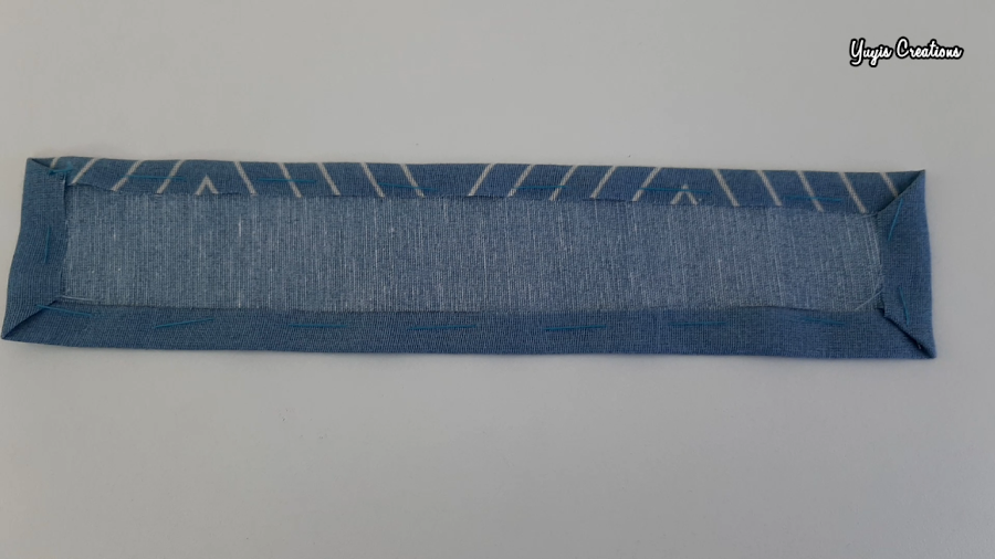 A las piezas de 70x10 las vamos a doblar a lo largo con el revés a la vista y cosemos a lo largo. Damos la vuelta, ponemos la costura a un lado y planchamos. Luego cosemos por todos sus bordes, metiendo 1 cm hacia adentro en los extremos: