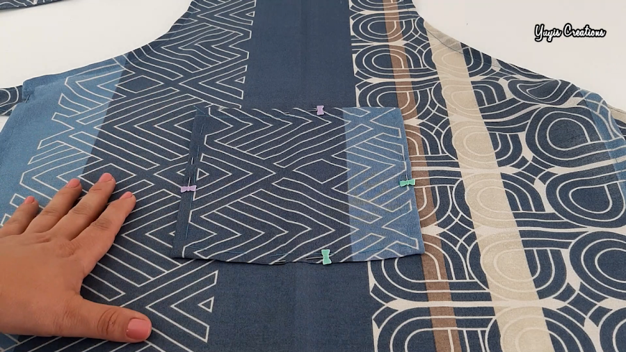 Ahora sí, cosemos por todo el borde y alrededor de la pieza de refuerzo, cosemos también las tiras de amarre a la cintura y el bolsillo en la parte frontal, para ello te recomiendo que te pruebes el delantal y lo cosas a la altura que te venga bien.