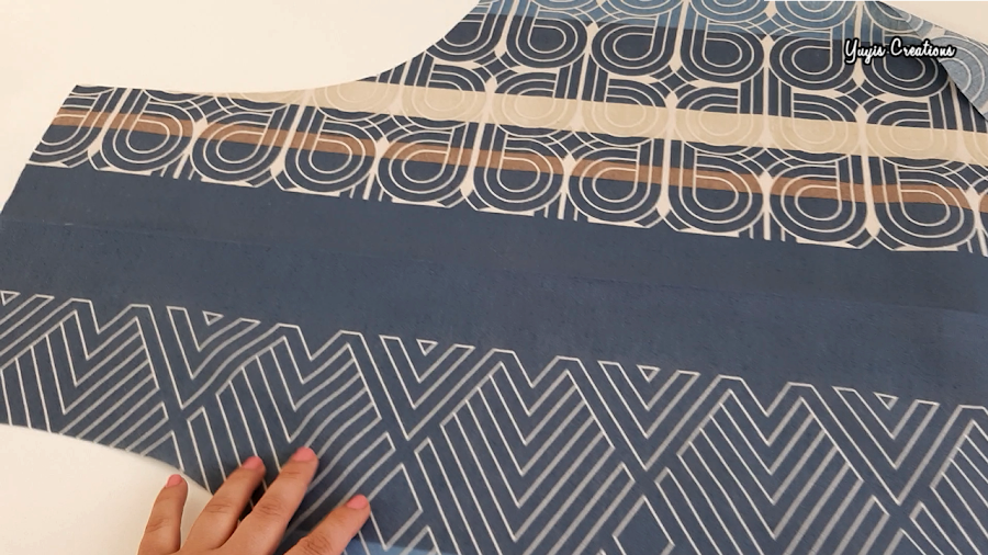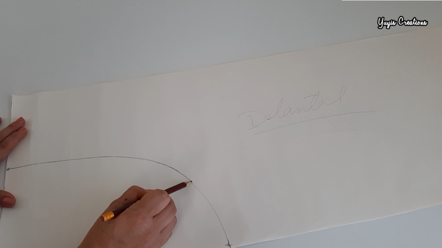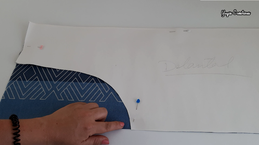 Una vez dibujada la curva, recortamos y usamos el patrón para cortar la tela. La tela la vamos a cortar doble, así que la doblamos a lo largo y ponemos encima el patrón con la parte recta hacia el doblez de la tela, de esta manera: