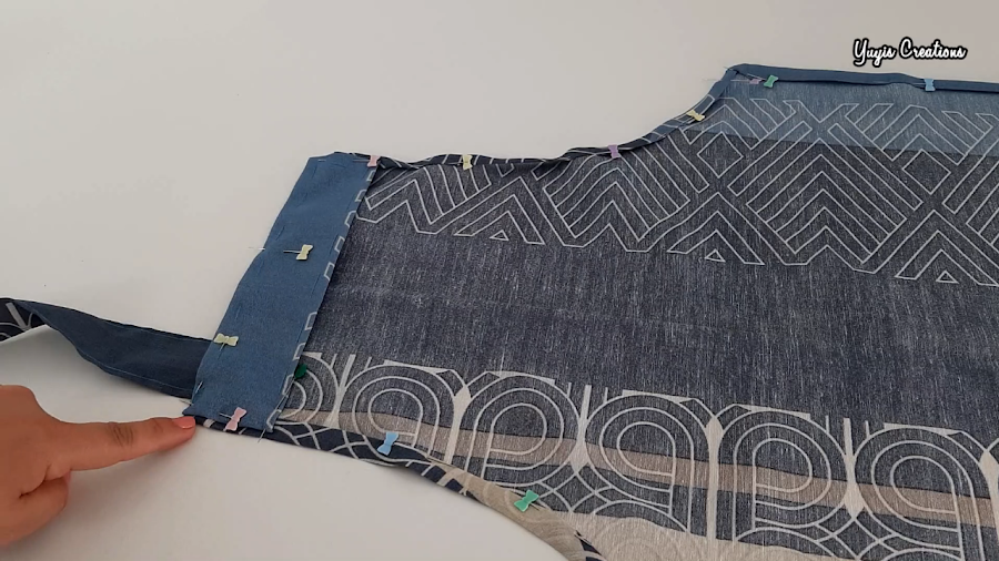 A la pieza principal del delantal le vamos a hacer un dobladillo por todo el contorno, doblando dos veces a 1 cm, luego colocamos la pieza de refuerzo del pecho en posición con el derecho a la vista y metemos una de las tiras que habíamos preparado antes y sólo un extremo, tal y como se aprecia en la foto de abajo: