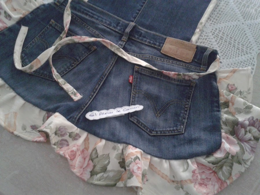 Y con otro trocito de tela vaquera un delantal para mi pequeña, que cada vez que cone sola...se pone que no hay por donde cogerla ;)