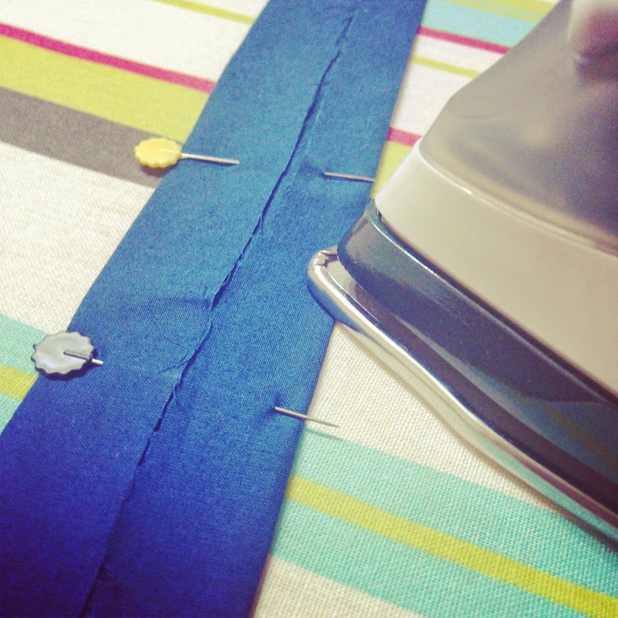 Para la tira puedes elegir una cinta al bies o hacer tu propia cinta de la tela pero cortada normal al hilo como he hecho yo, simplemente corta una tira de 1"5m de largo por 10cm de ancho y dóblala en tres partes para que quede bien marcada plánchala