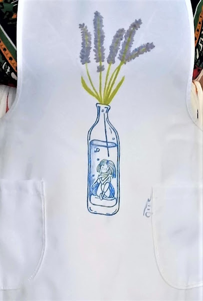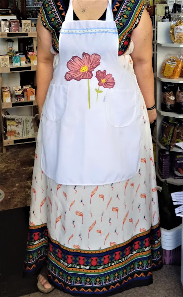 Delantales florales para una amiga ecologista, la siempre sonriente Ana de la HERBORISTERIA LAVANDA BIO, en Vigo. Ella siempre está ocupadísima, pero sus escaparates cambian continuamente, No sé como lo hace!