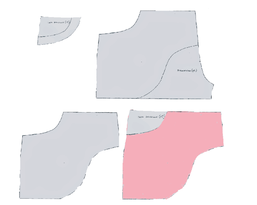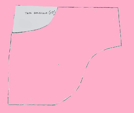 Para la otra parte del bolsillo, debemos colocar la tapeta en su hueco del patrón delantero y obtenemos la forma completa de esa parte del bolsillo. Así: