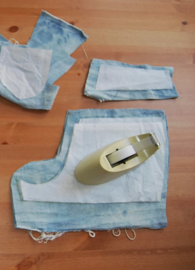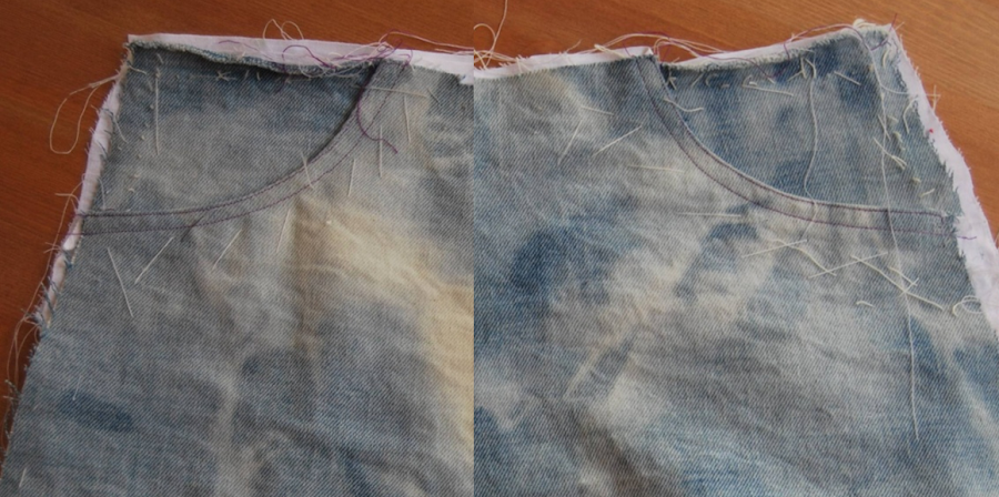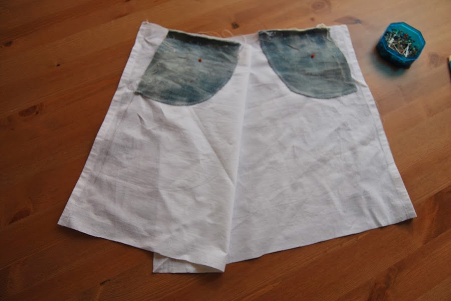 Para la otra parte del bolsillo, situamos un trozo de tela sobre el semi círculo del bolsillo y lo cosemos por el revés, siguiendo la marca circular.