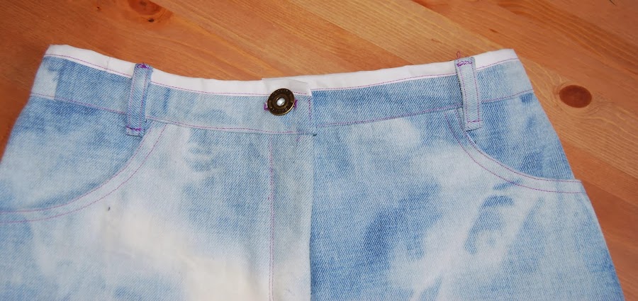 Cosemos la cinturilla colocando las trabillas. Hacemos los pespuntes y ojal y ponemos el botón de vaquero.