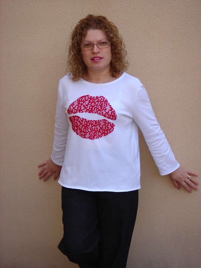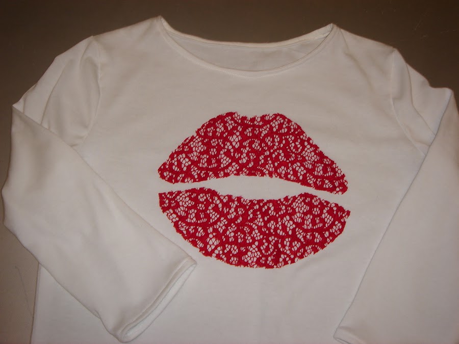 El tejido es de punto elastico de color blanco y el guipur de color rojo, no podia ser de otro color , para unos labios sugerentes.
