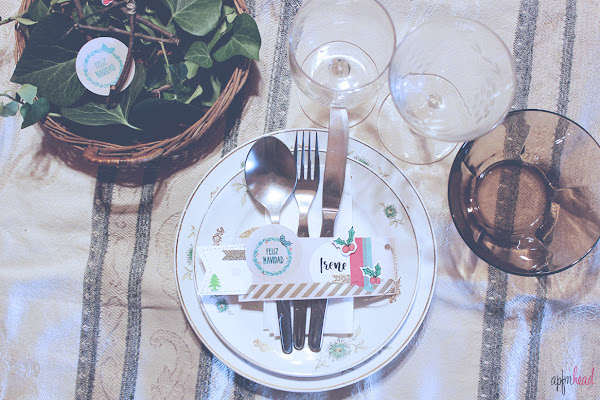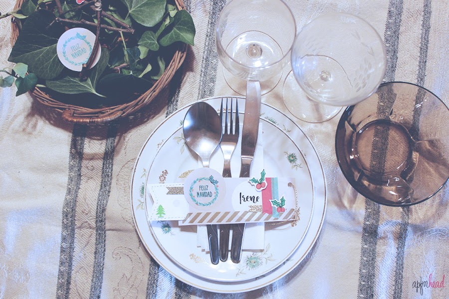 Finalmente, como he podido, he montado una pequeña mesa de Navidad. He cogido platos viejos, un mantel, algunas copas y he bajado al patio a por un poco de decoración natural.
