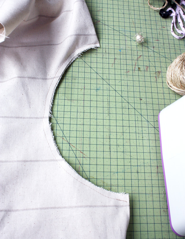 Dobla derecho contra derecho el dobladillo de 25cm y cose a 0,5cm la curva de los 10cm. Da pequeños cortes en la costura y da la vuelta, plancha.