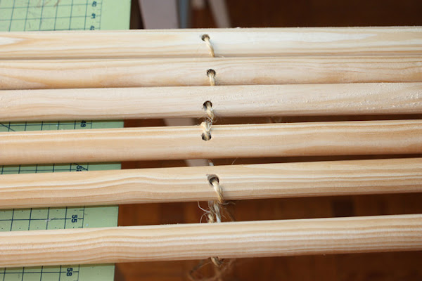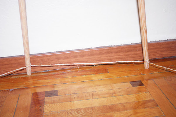 Vamos a pasar también la cuerda porlos agujeros de abajo girando también sobre cada palo para que quede mejor sujeto. Una distancia de unos 40 cm aproximadamente entre ellos esta bien.