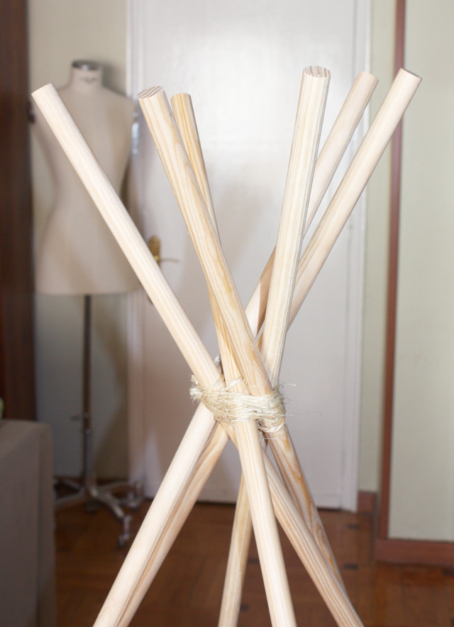 Para una mejor sujección yo le he cosido en el interior unas cintas de algodón a unos 30cm de la parte superior para atar cada palo a la tela por la parte interna.