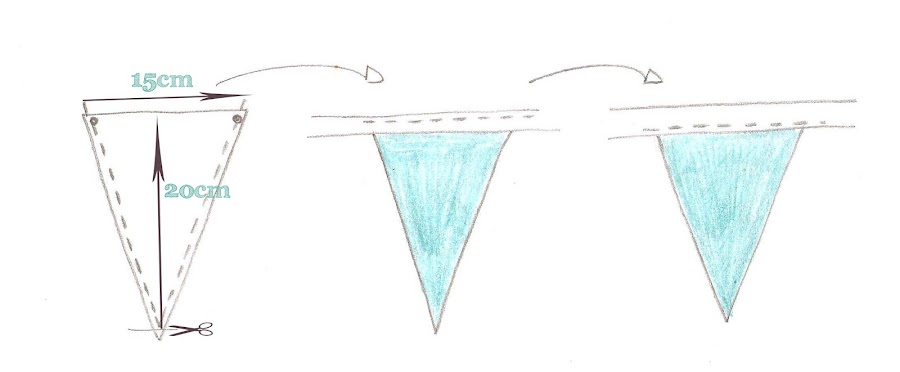 Y por último he heho una tíipca guirnalda de triángulos muy fácil de hacer, aqui os dejo medidas y paso a paso.