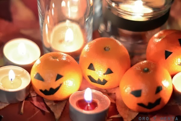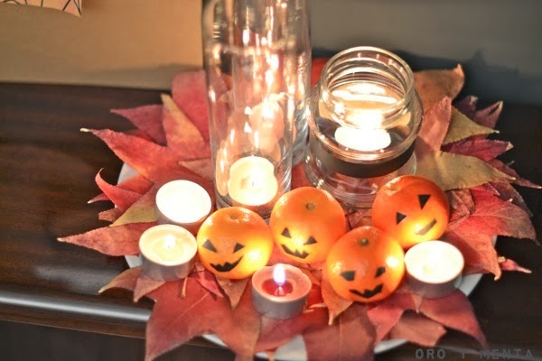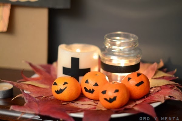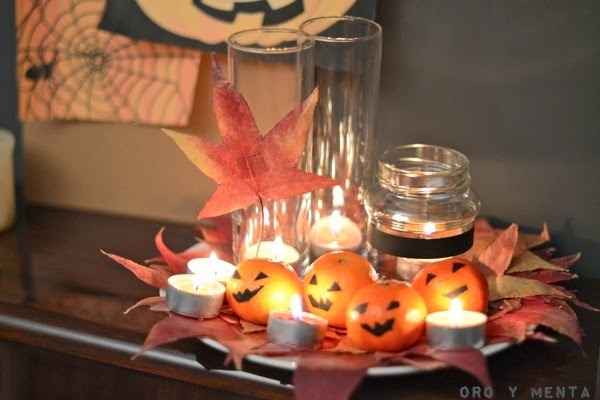 Este centro, al ser pequeño, es perfecto como decoración de Halloween no muy cantosa en la entrada de casa, para recibir a los niños que vienen a pedir caramelos...y luego si le quitamos los ojos a las mandarinas, nos sirve de decoración otoñal, así que, ¡doble uso!