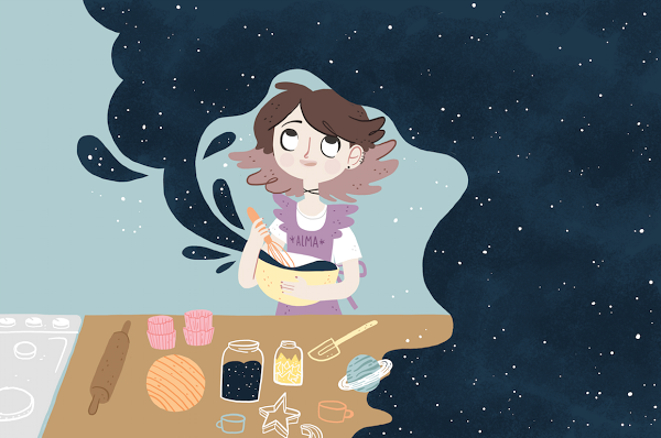 Porque sus gustos aparecen reflejados en muchas de sus ilustraciones, en las que muestra escenas cotidianas combinándolas con otras fantasiosas. Y para ello utiliza materiales tan diversos como el Photoshop, acuarela, tinta y lápices.