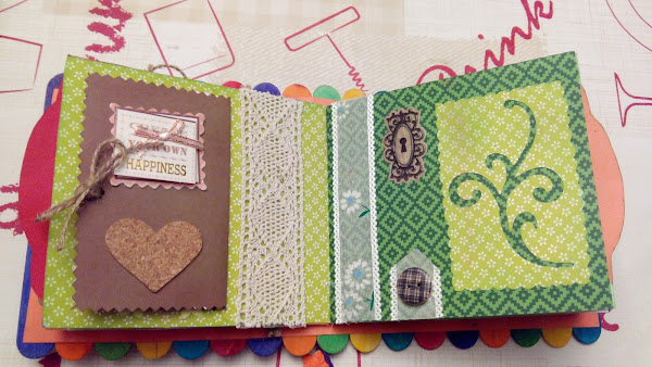 Después he cortado cartulinas y papeles decorados de scrap que son más resistentes 4 iguales que la cartulina de las pastas y 4 de un cm. menos de alto y ancho que la cartulina de las pastas para doblarlos y pegarlos entre si convirtiéndolos en pequeñas carpetas en las que después se pueden meter cartulinas con frases o fotos..