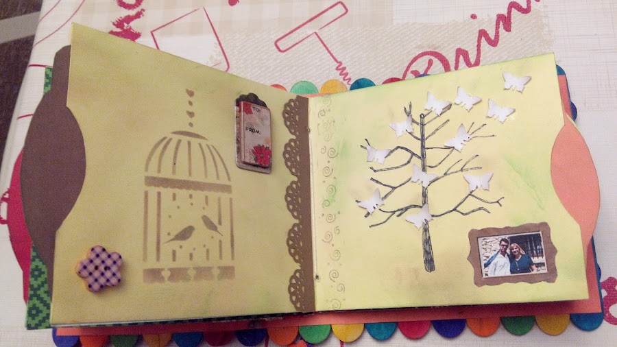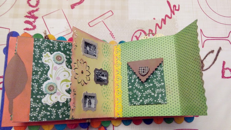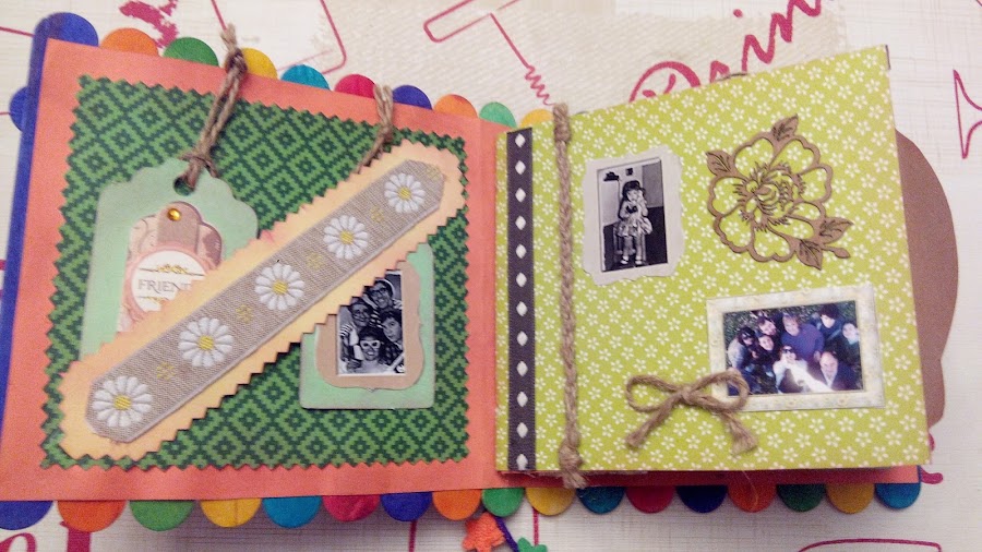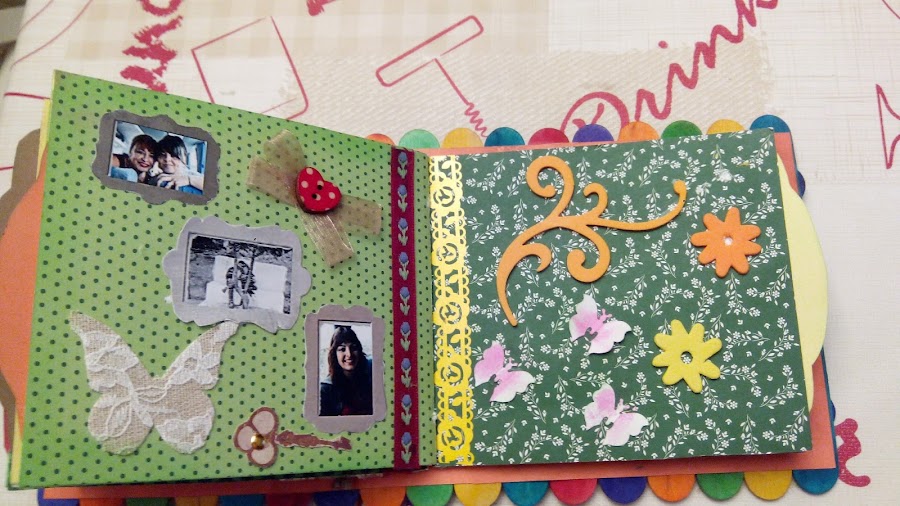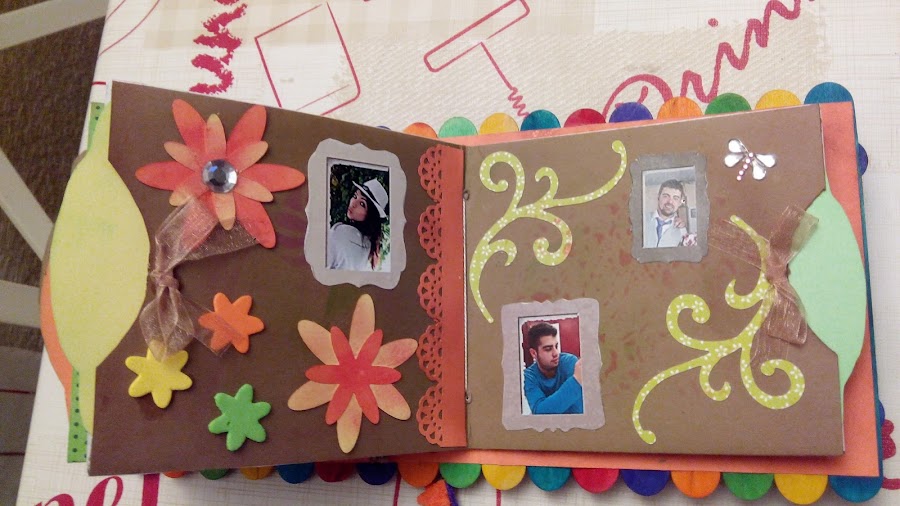 Luego utilizando la imaginación he adornado las hojas con apliques, botones, puntillas, cintas, etc. y he pegado fotos que he sacado por la impresora del tamaño que deseaba, me gusta el resultado y voy a investigar y trabajar más con esta técnica.
