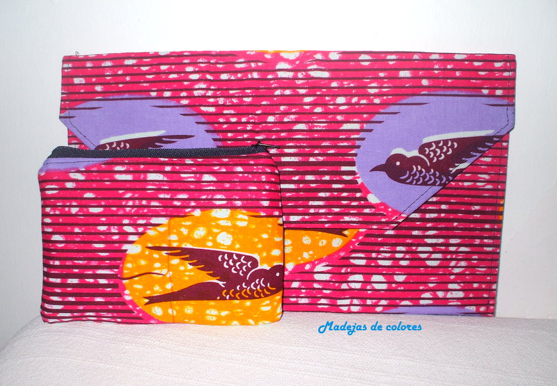 Ahora el estilo sobre, como esta fucsia con pájaros sobre fondo amarillo y malva y monedero a juego.