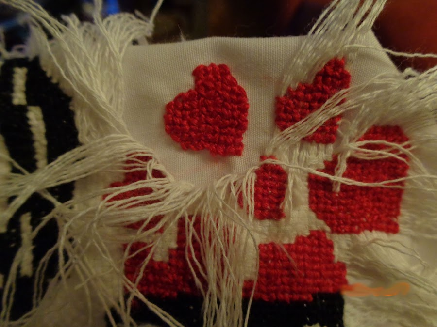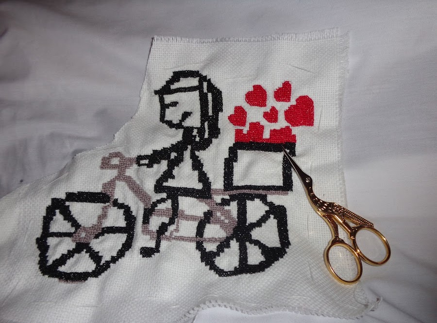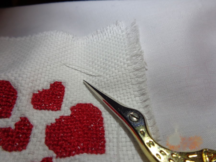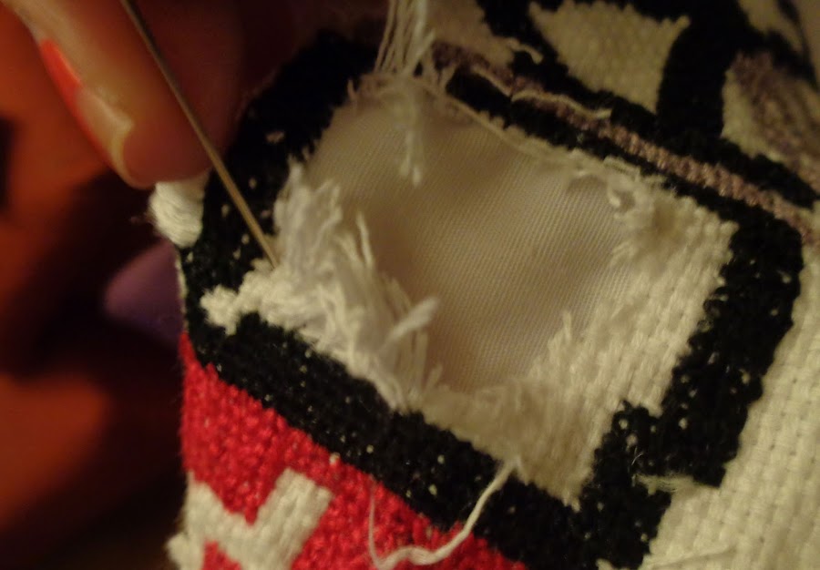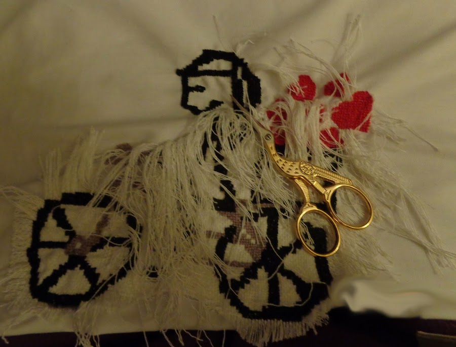 La tela Aida forma una red, con hilos en vertical y horizontal entrelazados, por lo que es relativamente sencillo de deshacer. Seguramente más fácil de lo que me resulto a mi Como veis mi dibujo tiene muchos recovecos, por lo que costaba que las hebras de hilo salieran fácilmente. Lo que yo hice (y si alguien puede aconsejar mejores métodos, encantada!) es ir deshaciendo poco a poco, incluso cortando para que fuera más fácil, como veréis abajo en la cesta.