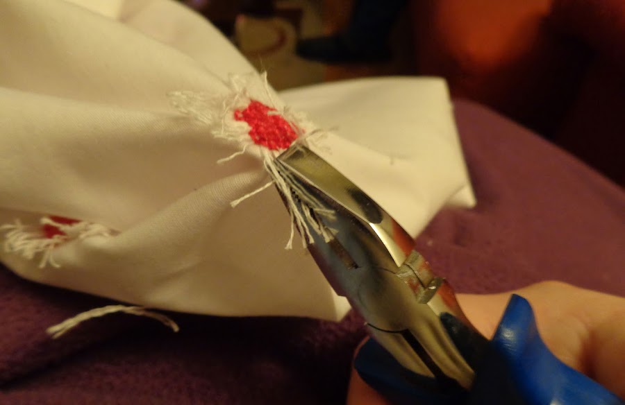 El problema que tuve, tanto con alicates como con la mano, es que algunos hilos están enredados con nuestra propia labor y es imposible sacarlos. Por lo que, he de admitir que en más de una ocasión, he tenido que cortar el hilo lo más arras de la labor posible y así salvar el trabajo.
