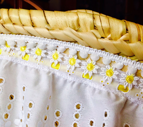 Como se puede ver, he utilizado puntilla, cinta de raso, estas margaritas preciosa y cinta de madroño