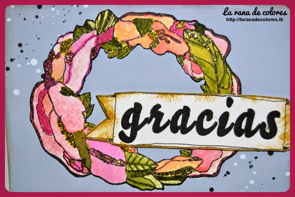 Para este último trabajo he elegido una tarjeta que me ayudara a transmitir todo lo que quiero transmitir, y me pareció genial utilizar este sello de Con Sal y Pimienta, que aunque a priori no llama la atención, queda muy bonito. Yo lo he coloreado con tintas Distress y Distress Markers y además le he puesto unos detalles con Stickles Dorado. Unas gotas de tinta blanca y negra en el fondo y ya está, una tarjeta fácil de hacer que queda preciosa.