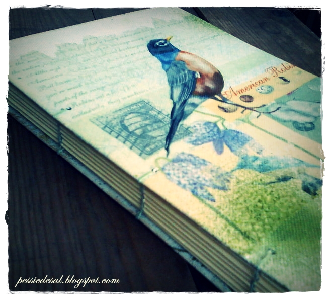 La primera: tapas en lienzo que me apeteció dejar en blanco, para resaltar la servilleta que puse en découpage, y que me encanta...un toque de tinta en spray y algo de distress para envejecer. La parte de atras hecha con un papel de 7 gypsies y las hojas me pareció que quedaban más bonitas en color crema, que le da un toque de elegancia... el cosido con un hilo color turquesa.