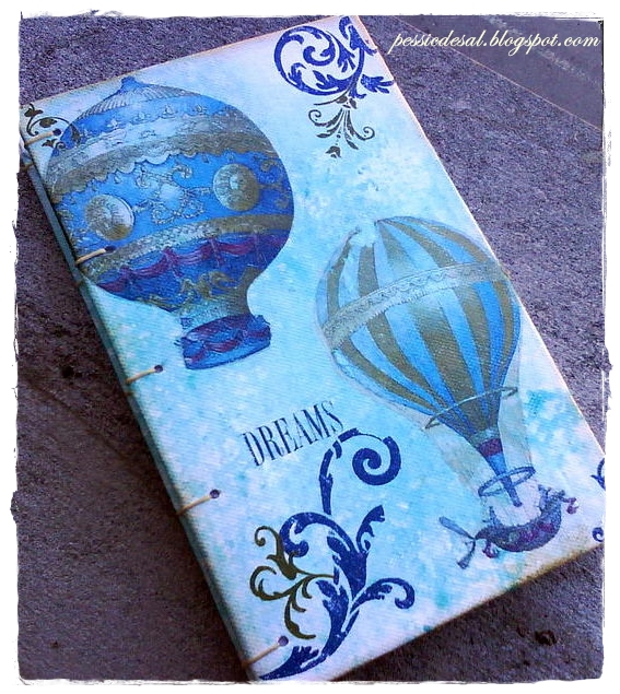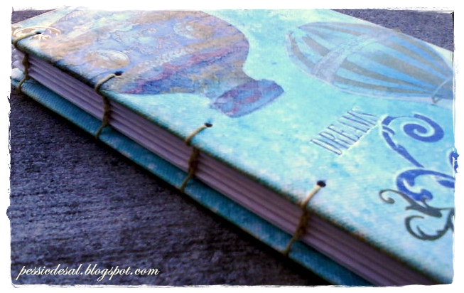 también aqui he hecho découpage, con estas servilletas de globos antiguos y he puesto como adorno unos rubbons de arabescos en los mismos colores y un titulo. El cosido está hecho con un hilo algo más grueso, de encuadernación, en color crudo.