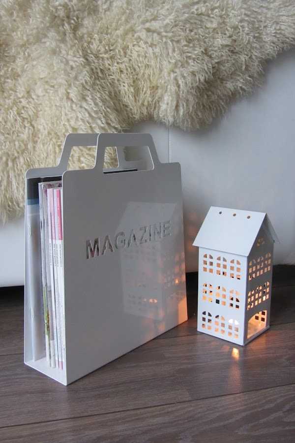 Al Lado del sofa, mi porta revistas y otras de mis casitas,todo en zinc, vease al fondo la rama iluminada, la cual permanecera toooooodo el año!