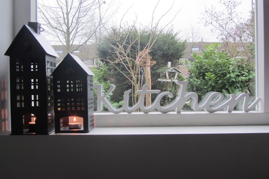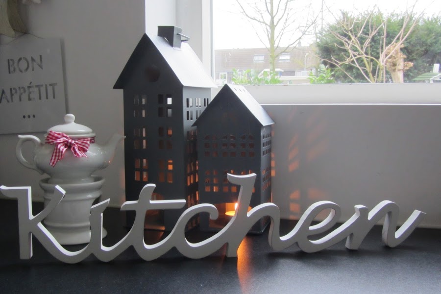 En la cocina, deje las casitas de zinc y una frace en madera con la palabra cocina en ingles y claro mi jarrita del té que no me puede faltar!