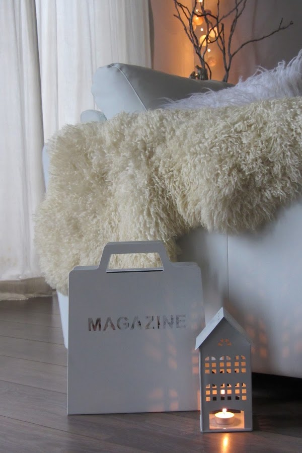 Al Lado del sofa, mi porta revistas y otras de mis casitas,todo en zinc, vease al fondo la rama iluminada, la cual permanecera toooooodo el año!