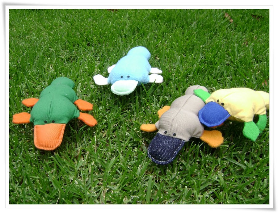Estos ornitorrincos los propuso Charitenerife en el post del Sal Entre-lazadas de Flopy, mis hijos los vieron y enseguida se antojaron, pero mi hija se antojó de tres.