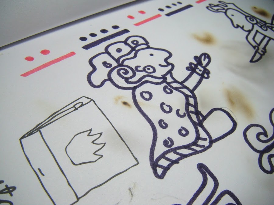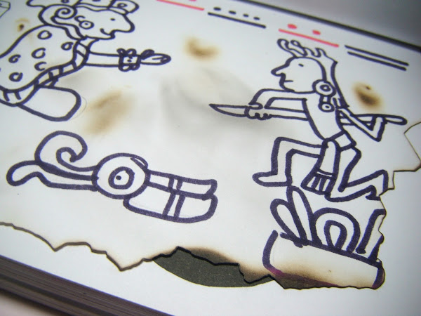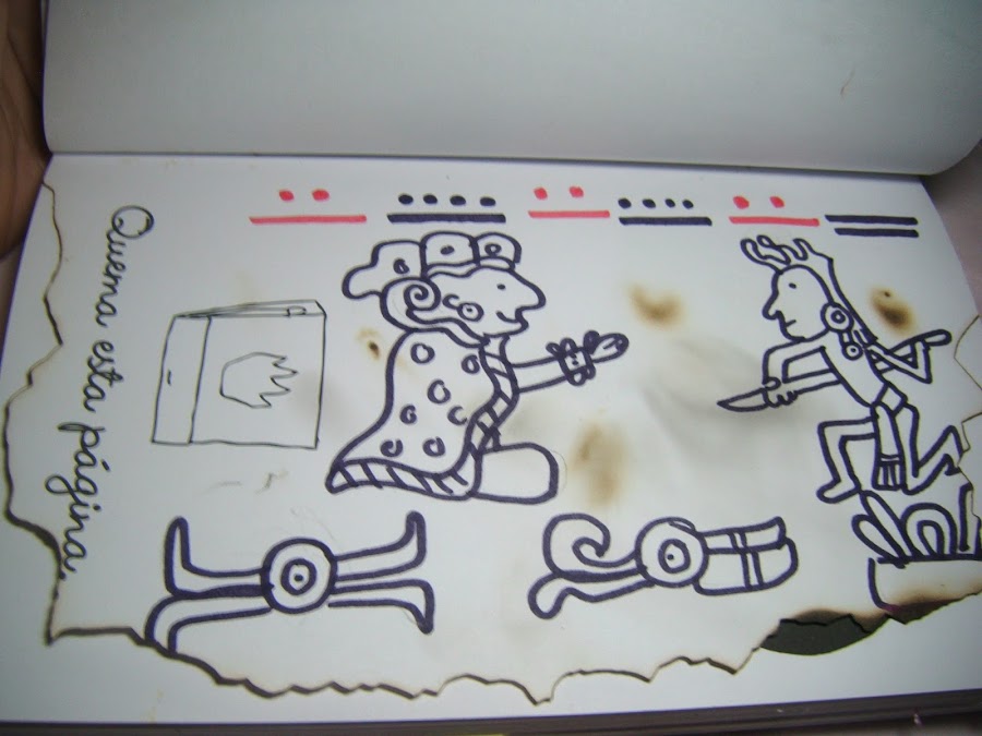 Ésta es muy conocida, dice que hay que quemarla y bueno, se me ocurrió primero dibujar como un códice maya (que la historia dice que fueron quemados por los evangelizadores) y una vez terminado el dibujo le quemé las orillas y un poco a través de la hoja. De este capítulo ésta es la página que más gustó como quedó.