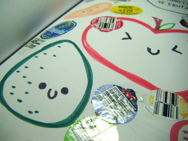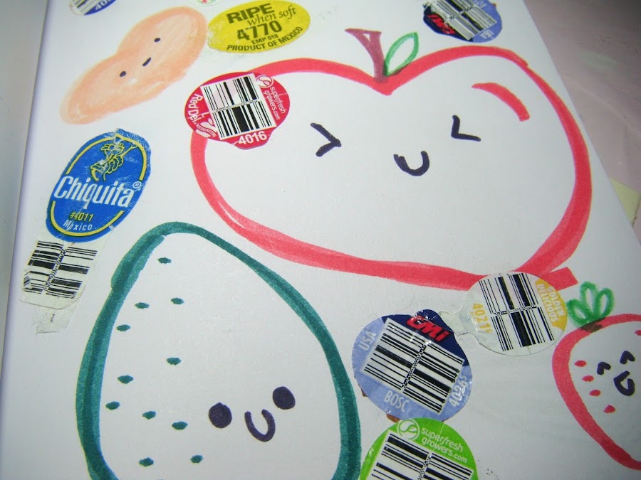 Ésta página dice que hay que hacer una colección de las estampitas que vienen pegadas en la fruta, y bueno puse unas poquitas porque fueron las únicas que encontré diferentes, si no se iba a llenar toda la hoja de estampas iguales y como que no me gustaba mucho esa idea. Ya para decorar solamente le dibuje una manzana, un aguacate (según yo), una fresa y lo que con mucha imaginación parecería durazno.
