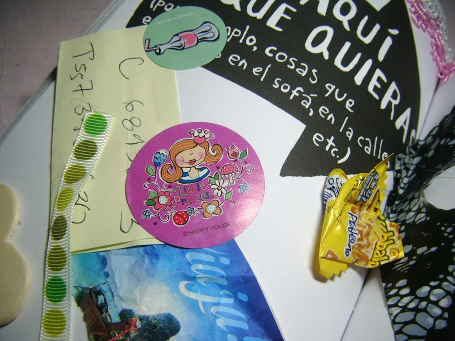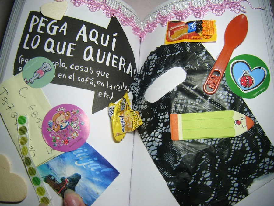 Para ésta página pide que pegue lo que yo quiera, bueno, como no quería pegar nada en especial esculque en mis libretas, en unas cajas, en las bolsas de mi pantalón, en mi mochila para la escuela y en general en mi casa, puse lo que encontré, sin razón alguna. Encontre una basura de chicle, una cuchara para helado, una bolsa coqueta, estampitas, una foto que estaba en un ticket y demás cositas.