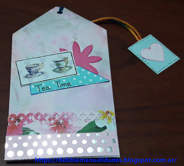 Le pase un trocito de lana multicolor y le pegue un papel cuadrado para simular la etiqueta del saquito de té