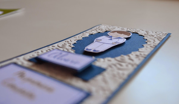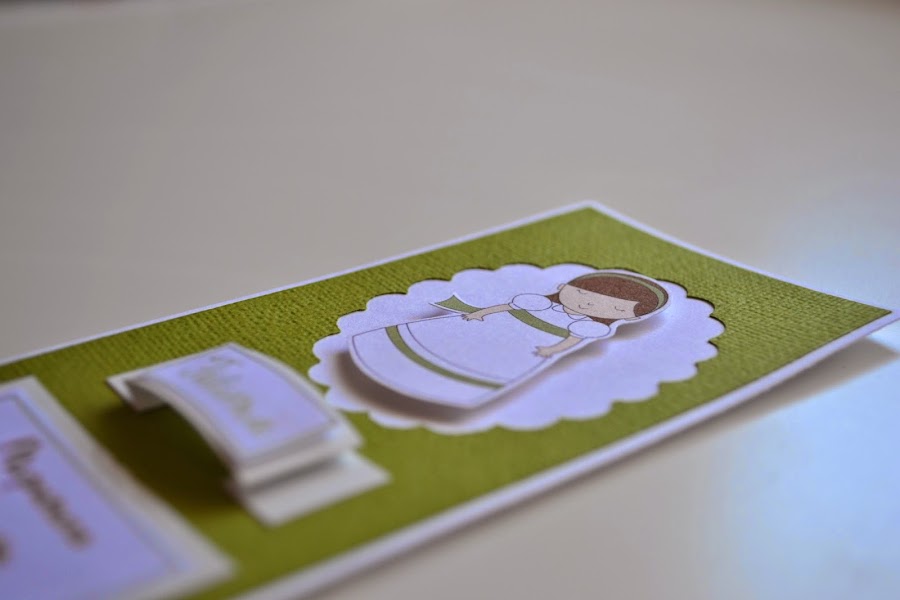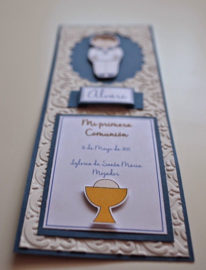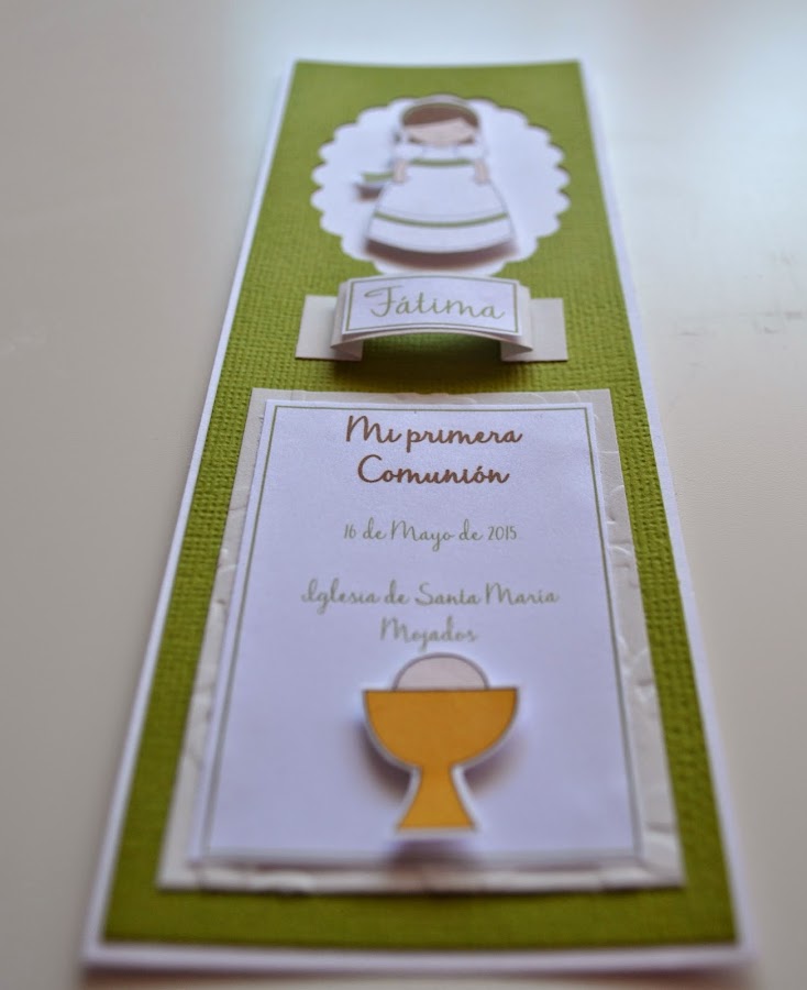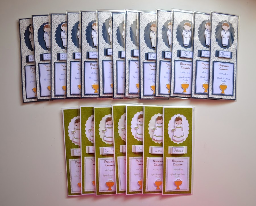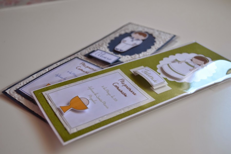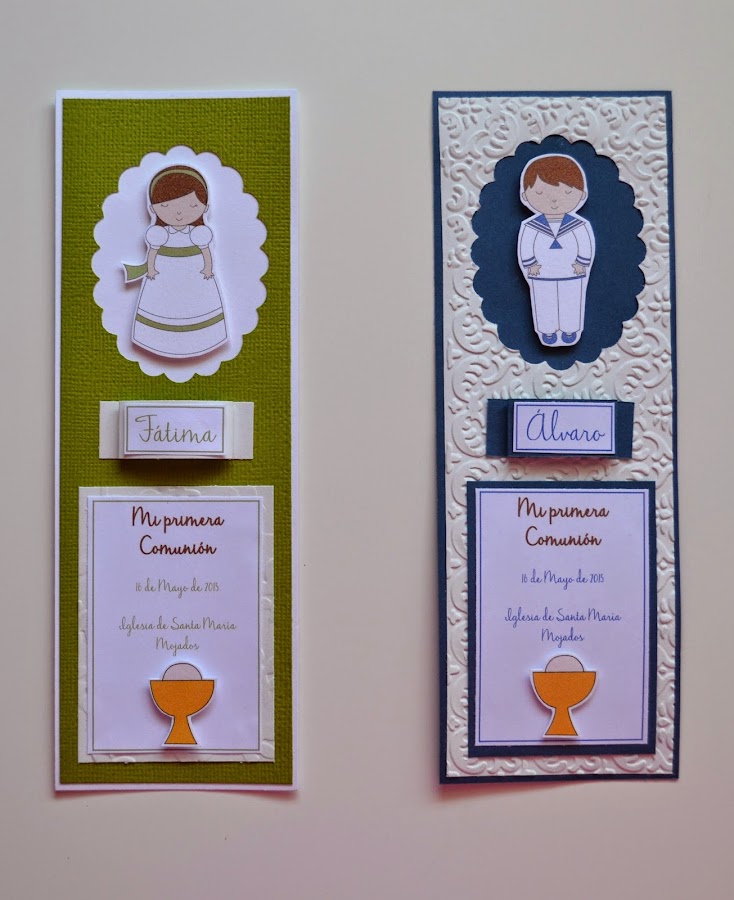 Diseñé dos modelos: para niña y para niño, todos ellos personalizados con los nombres, ¡por supueso! El de niño es azul con un bonito papel texturizado en color blanco, y el de niña tiene el fondo en color blanco y un papel verde texturizado también. En ellos hay una niña o un niño en la parte superior, seguido de su nombre, y en la parte inferior he colocado el recordatorio (fecha y lugar del evento).