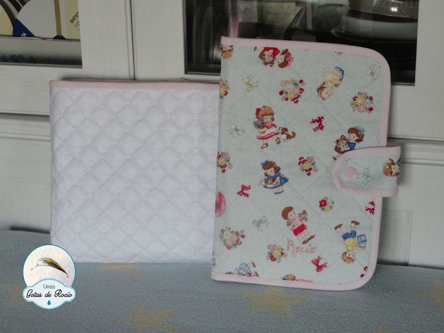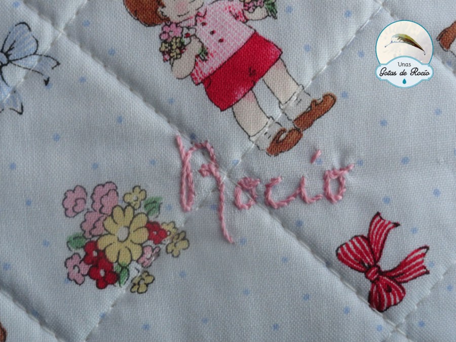 Y por último el nombre, en rosa también. Barajé posibilidades y me decanté por bordarlo en pequeño tamaño para no pisar ningún dibujo, pues no sólo desluciría el estampado sino que se leería con dificultad. Para que no fuera así hubiera debido ser bordado a máquina, que siempre resalta más. También calculé que si lo hacía un poco más grande, aunque no pisara el estampado, quedaría demasiado justo, sin margen que armonice la totalidad. Ya veis, nada es casual, todo está pensado al milímetro, como siempre intento y con lo que disfruto.