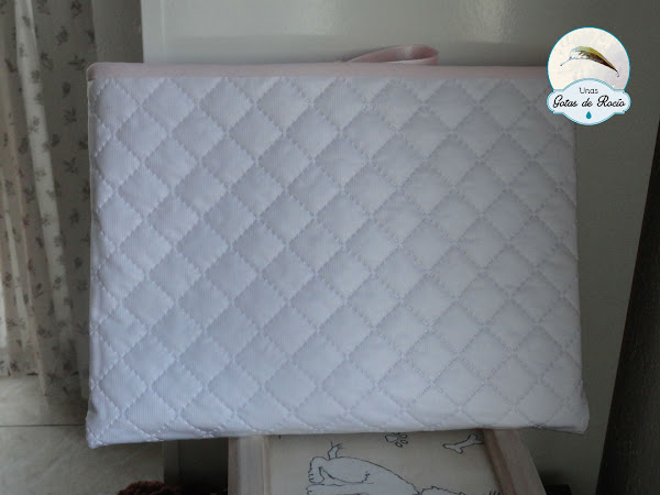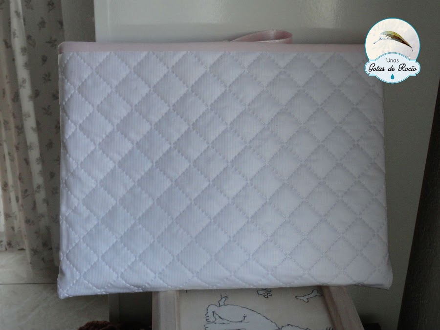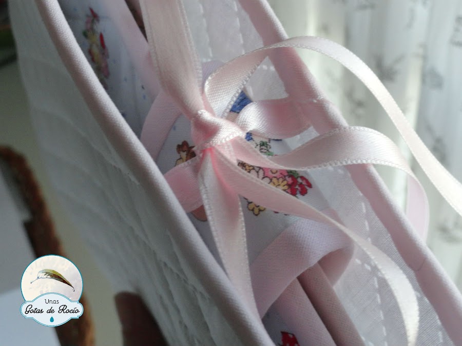 Detalles en rosa bebé y poco más. La cinta para el cierre, en raso, que aunque los brillos no están de moda, una cinta de raso es un clásico que obvia las modas del momento.