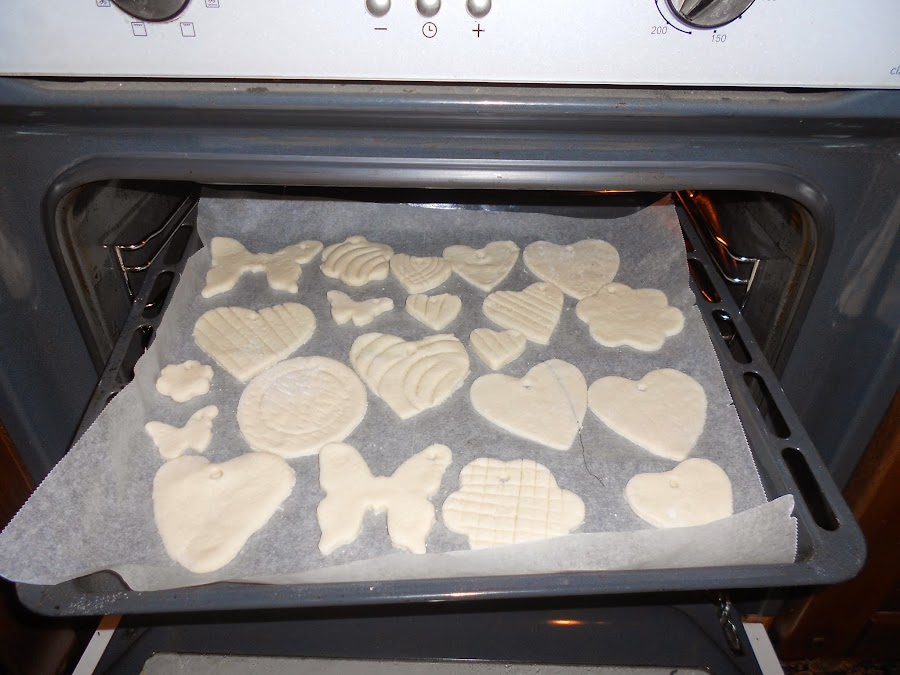 5- Cuando ya tengamos todos los adornos a crear, con la ayuda de un palillo o la punta de un lápiz le realizaremos los agujeros necesarios para que después los podamos colgar. Una vez perforadas, ya podemos poner las figuras a hornear. El objetivo es que se sequen totalmente, por lo que deben estar en el horno durante unas 4-6 horas a 200ºC.