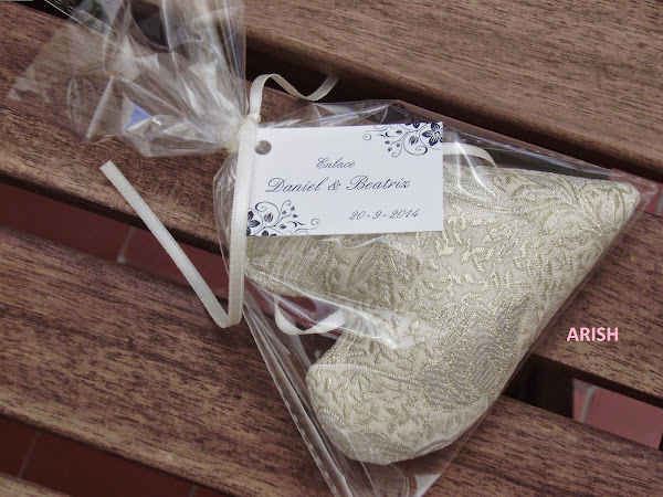 hice un bolso en tejido brocado nácar y oro con flores recortadas aplicadas por delante y en el interior metí bolsitas de celofán con un corazón del mismo tejido con una cintita estrechita para colgar y que estaban rellenos de lavanda, no os podéis imaginar lo contenta que íba la novia con su bolso colgado del brazo repartiendo entre las mesas y detrás de ella íba el novio que también regaló algo artesano, una botella de cerveza que él mismo había destilado y embotellado y mirar qué etiqueta tan chula puso