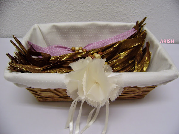 las he hecho con una tela de seda marrón muy fina con hilos dorados y con 3 cuentas de madera cada una y para las niñas las hice un poco más pequeñas en batista rosa con lunares blancos y las cuentas de madera un poco más pequeñas; las coloqué en un cestito de mimbre que forré con brillantina de color crudo y la adorné con una flor recortada de organza y unas cintas de raso.