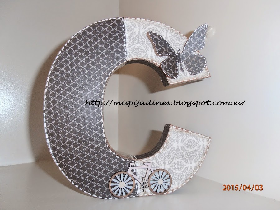 La letra C es para chico por eso elegí los tonos grises y así combinaba bien la otra letra, le puse el cosido que tanto adorna y los detalles de la mariposa y la bici...