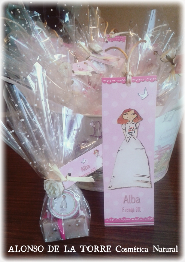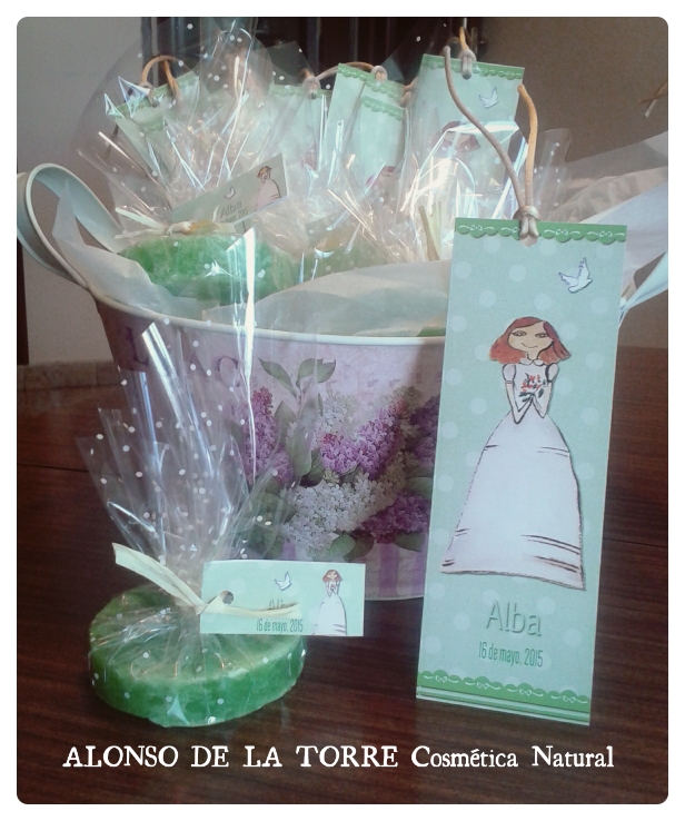 Detalles Personalizados de Comunión:Cada jabón de glicerina va envuelto con celofán decorado y rafia y lleva una etiqueta con el nombre del niño o niña y la fecha de la Primera Comunión. Os ofrecemos además la opción de añadir un recordatorio/marcapáginas personalizado a juego con la etiqueta.