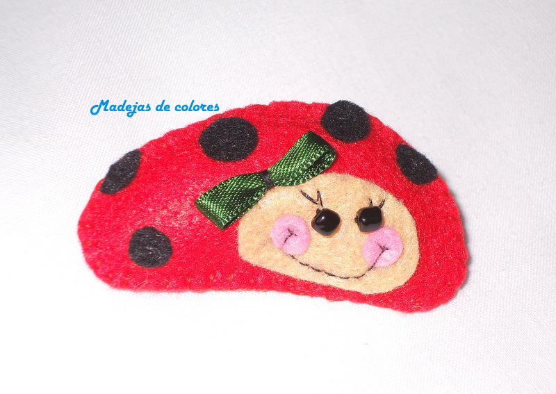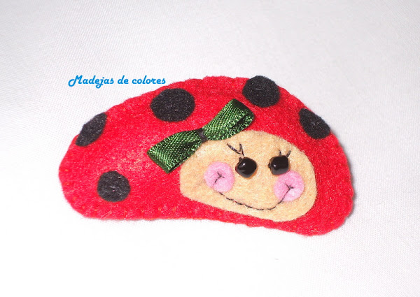 La mariquita pequeña, es un broche más para su colección. Me gusta como quedó con esa carita tan tierna, sus mofletes y como es muy coqueta, unas grandes pestañas y un lacito en su cabeza.