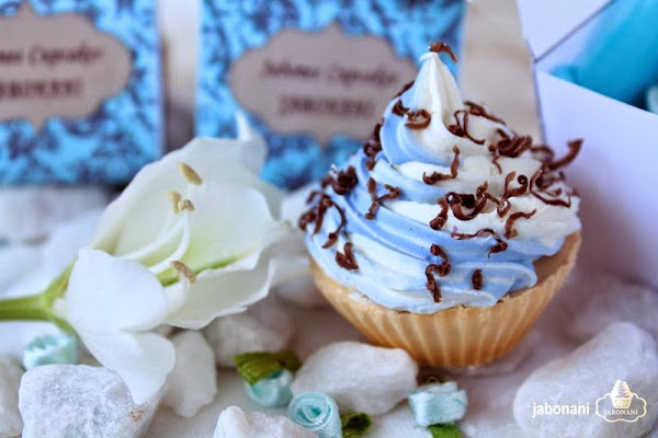 Su mami Amparo, eligió para la ocasión unos jaboncitos en forma de cupcakes, en tamaño mini, los cuales solo elaboramos exclusivamente para eventos, junto con unos jabones en la tradicional pastilla en tamaño mediano, ambos detalles los personalizamos y le propusimos el diseño y los colores, tanto para el envoltorio como para las cajitas,?.. como no, en tonos azules combinados con tonos de color chocolate, que os parecen?..