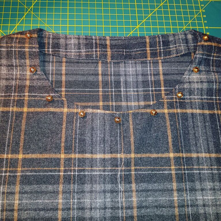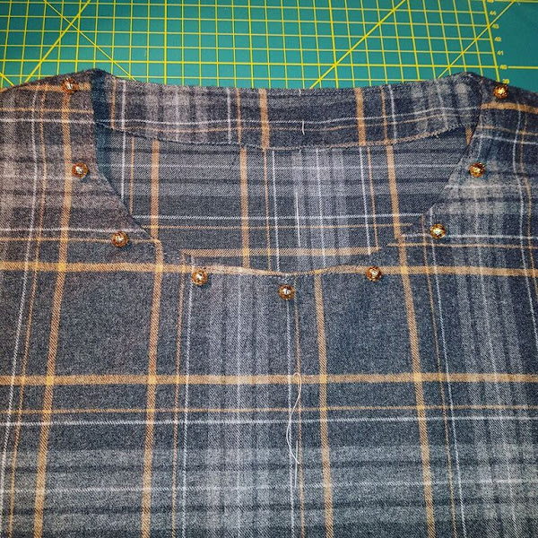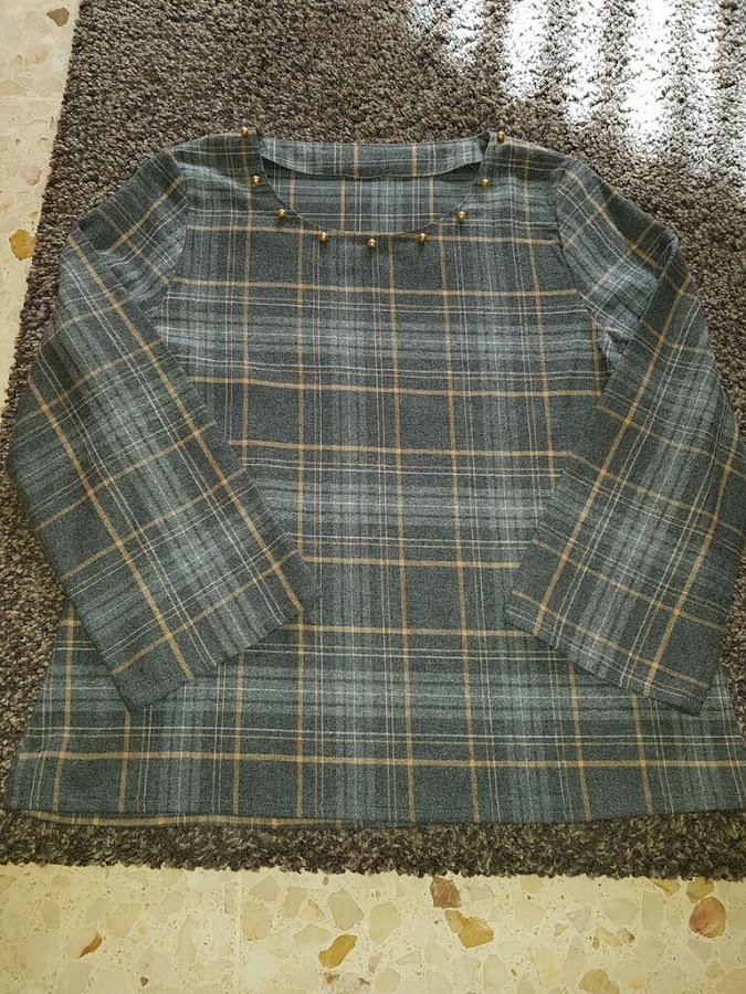 Este tejido de cuadros grises que compre para hacer una blusa es un poco soso la verdad , pero con el detalle de las perlas doradas en el cuello la cosa cambia.