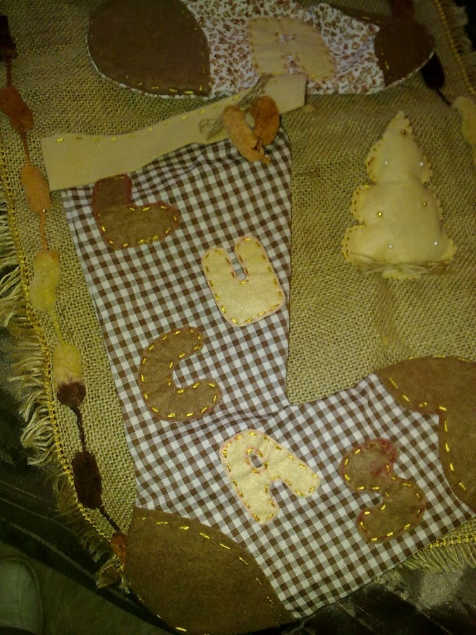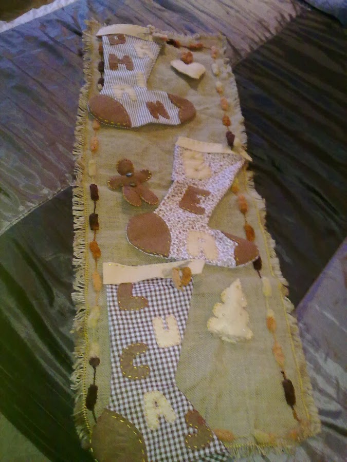 El colgante compuesto por una bota para cada uno de los miembros de la unidad familiar donde poder meter las sorpresinas típicas de estas fiestas. Realizado en arpillera y las botas y adornos en fieltro y telas en las mismas tonalidades pero con estampados diferentes.